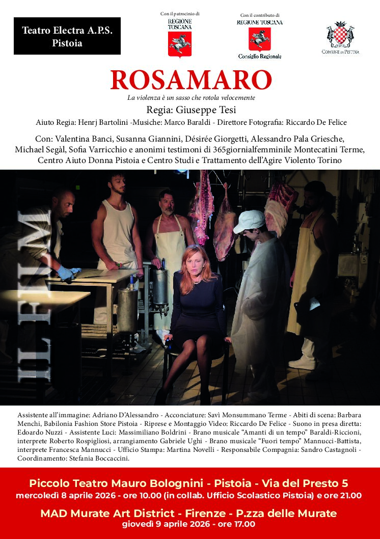 Piccolo Teatro Mauro Bolognini Via del Presto 5, Pistoia, PT, ItalyROSAMARO La violenza è una sasso che rotola velocemente Regia: Giuseppe Tesi Aiuto Regia: Henrj Bartolini - Musiche: Marco Baraldi - Direttore Fotografia: Riccardo De Felice Rosamaro è un film […]